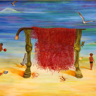 GR: The process of creation starts in my mind months before I sit in front of canvas. I make rough sketches which change often. Once I’ve decided on a composition, it starts working in my mind . . . the size, colours, materials, and so on. The picture I create in my mind may not appear the same on canvas, so it undergoes changes at different levels. My works with rag impressions on canvas took about four years of hard work. I discarded more than a dozen canvases during my experiment. I need a very large space as I cannot move the un-stretched canvas for about a month on which I create the impression with gunny rag. Once I separate gunny from the canvas, I again allow the impression to dry completely. I work with paint and thin brush to get the desired shades and paint on it the required object. I’ve moved on from just natural gunny colour to coloured gunny rag. I’ve also introduced print to support my idea and acrylic along with oil paint. One thing has led to another and finally I've started pasting a few gunny threads also on canvas.